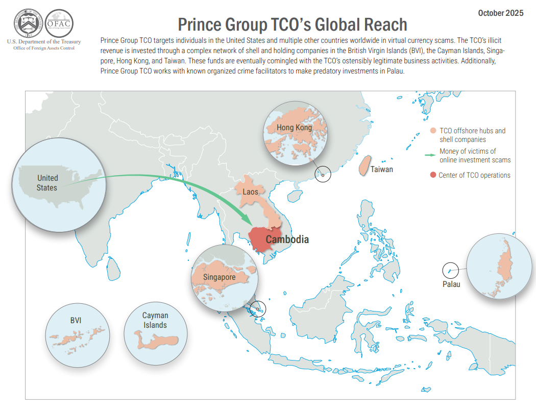 In mid-October 2025, the U.S. Department of the Treasury, in coordination with FinCEN and the UK Foreign, Commonwealth & Development Office, unveiled a sweeping set of sanctions targeting crypto-related online fraud and forced-labor networks across Southeast Asia. The most prominent name on the list is the Prince Group, a Cambodia-based conglomerate now designated as a Transnational Criminal Organization (TCO). According to the Treasury’s press release, the group allegedly operated vast online scam compounds where trafficked workers were coerced into running “pig-butchering” investment schemes involving cryptocurrency transactions.